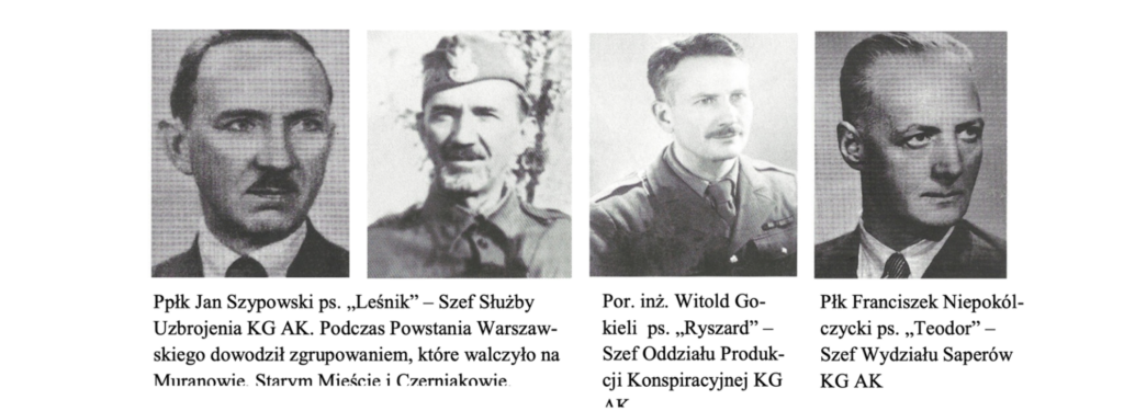 Centralnym punktem projektowania i tworzenia broni dla Kierownictwa Dywersji Armii Krajowej, znanego jako “Kedyw”, było Biuro Badań Technicznych w Warszawie. To biuro zajmowało się opracowywaniem systemów konstrukcyjnych, produkcją oraz testowaniem materiałów wybuchowych, granatów, broni palnej i sprzętu minerskiego, a także szkoleniem specjalistów. Głównym koordynatorem produkcji konspiracyjnej dla wszystkich oddziałów AK był inż. Witold Gokieli, “Ryszard”. Funkcję szefa służby uzbrojenia, odpowiedzialnego za dystrybucję, przechowywanie i ochronę wytworzonej broni i sprzętu, pełnił ppłk Jan Szypowski “Leśnik”, który później został dowódcą zgrupowania na Starym Mieście podczas Powstania Warszawskiego. Jego zastępcą był prof. Dionizy Smoleński, późniejszy rektor Politechniki Warszawskiej i ekspert od materiałów wybuchowych.